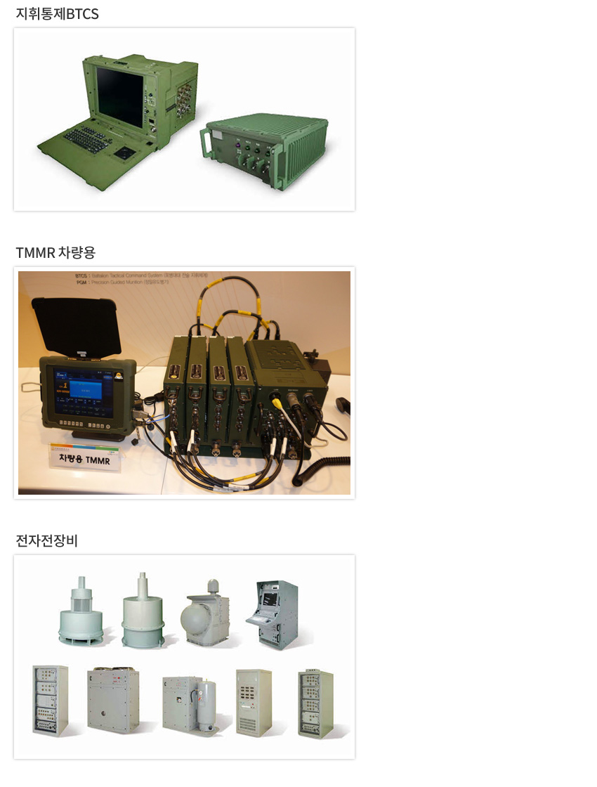 빛샘전자㈜ 방산사업부는 군의 지휘통제체계에 포함되는 주요장비(BTCS, 차량용 TMMR 등)에